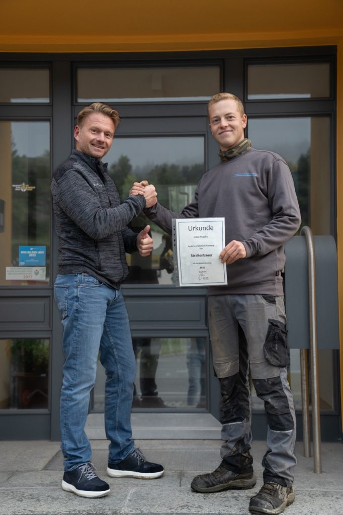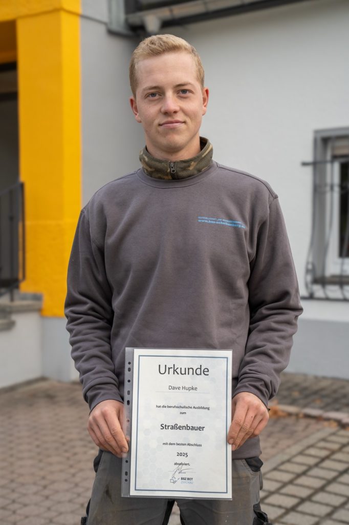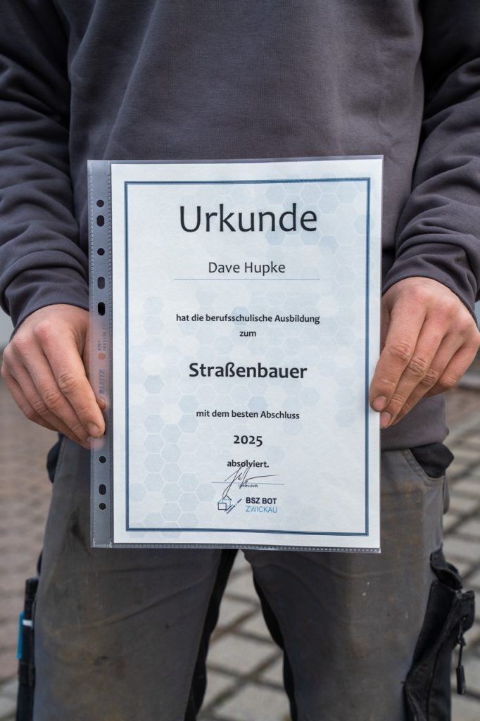 Drei Jahre als Azubi, viele Baustellen und jede Menge Praxiserfahrung, die Dave in dieser Zeit sammeln konnte. Seine Ausbildung läuft aktuell noch, doch den ersten wichtigen Schritt hat er bereits geschafft: Er hat den Abschluss als Tiefbaufacharbeiter erfolgreich in der Tasche und zählte dabei zu den Besten im zweijährigen Berufsschulabschluss am BSZ für Bau und Oberflächentechnik in Zwickau.